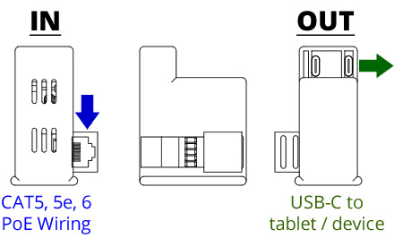 Locate the nearest wall outlet (120-240V A/C) to your tablet mounting location. Plug in our VidaPower Ultra Injector to the outlet, and connect a standard CAT/Ethernet cable to the appropriate port. Next, run the powered cable to your tablet location (Supports up to 375' [115m] w. CAT5/5e/6) and connect it to the AT-USBC-JB.