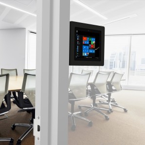 The combination of this sturdy steel mount, rugged plastic resin enclosure, with permanent glass mounting allows the tablet to be protected against high traffic withstand rough use in public setups - yet stylish enough to blend into any environment!