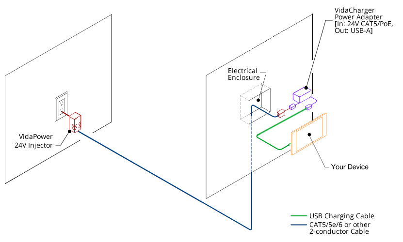 Don't have a 24V POE switch to provide power to your VidaCharger 24V PoE to USB Power Adapter? No Worries! Our VidaPower 24V CAT5 Power Injector is a great solution. Use this to inject a low voltage current into a standard CAT5 cable (we sell them too) to keep your VidaCharger 24V Power Adapter charging your USB device.