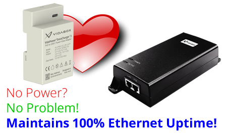 Worried about battery longevity or swollen cells, and need wired Ethernet? DataCharger2 is the answer! Add a battery monitoring app, & connect your VidaPower Injector with a controllable power outlet. Have your app turn off the outlet when the battery is charged, then the outlet back on at low battery! Ethernet stays connected even with power loss (see above) for full functionality!