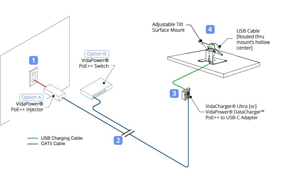Next, run the powered PoE/CAT5/5e/6 cable to your tablet location [3] and connect it to the 48V VidaPower® DataCharger™ [International Only] or 48V VidaCharger™ Ultra [USA Only].